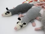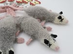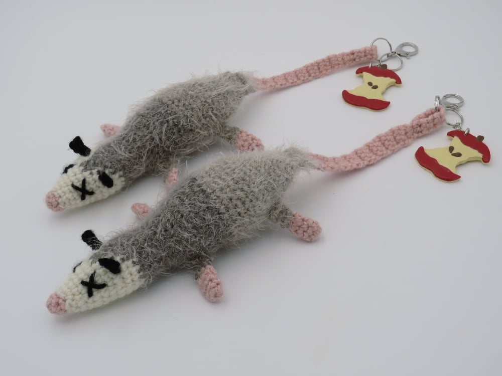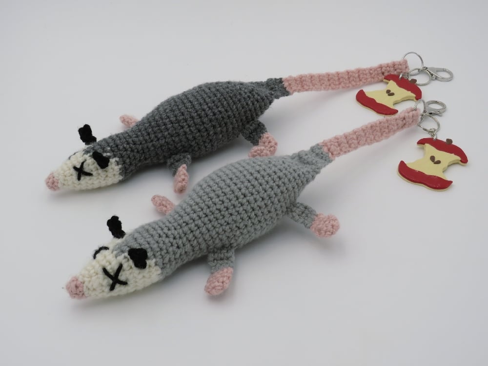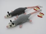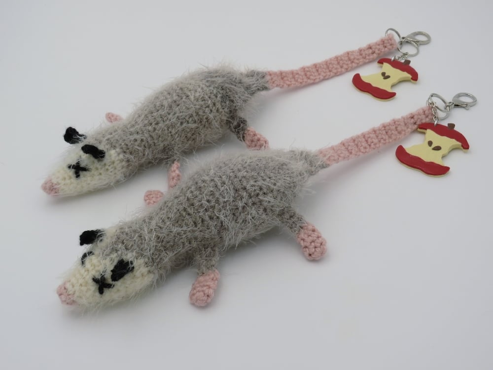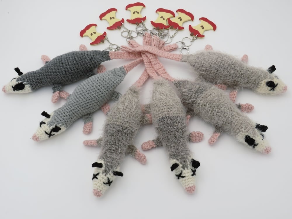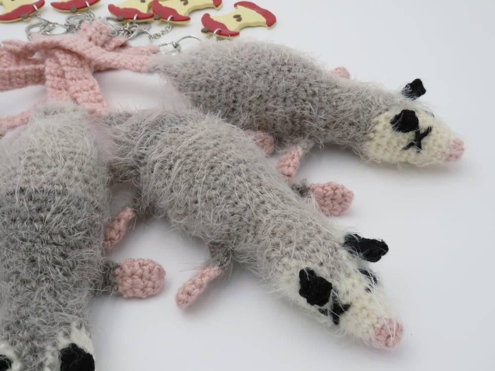 Partially scraggly and scraggly Opossum Charms are made with acrylic and nylon yarn mix