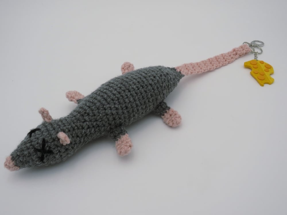 Crochet Rat Charm stuffed with silky poly-fill and a polymer clay cheese charm with a gloss glaze